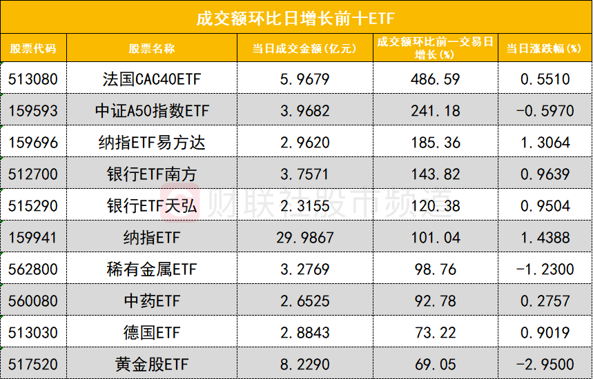 从成交额环比增长前十的ETF来看,法国CAC40ETF(513080)成交额环比增长486%位居首位;中证A50指数ETF(159593)成交额环比增长241%位居次席。