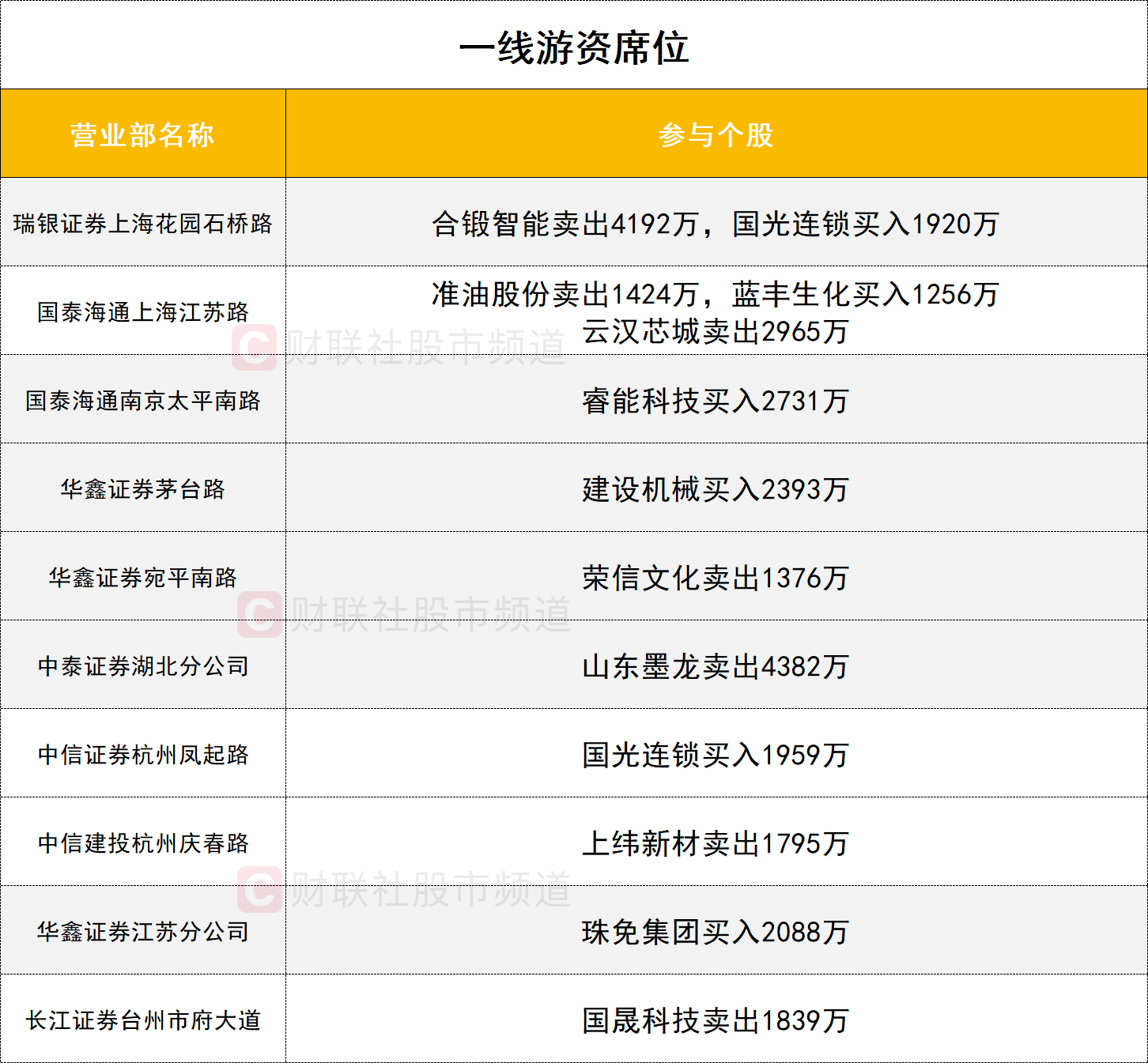 一线游资活跃度较低,合锻智能遭一家一线游资席位卖出4192万。山东墨龙遭一家一线游资席位卖出4382万。