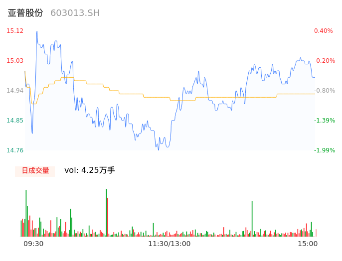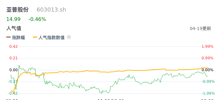 04月19日,亚普股份收报14.99,股价涨幅-0.46%,成交金额6348.56万元,换手率0.83%。
