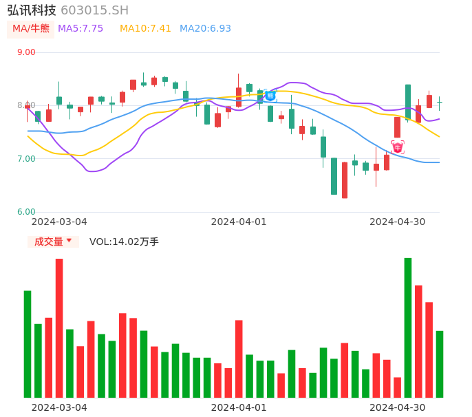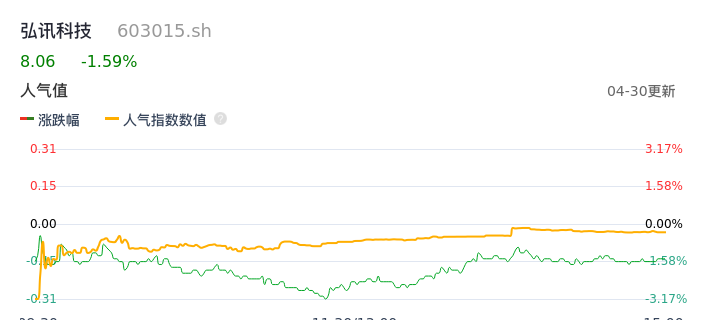 04月30日,弘讯科技收报8.06,股价涨幅-1.59%,成交金额1.13亿元,换手率3.47%。