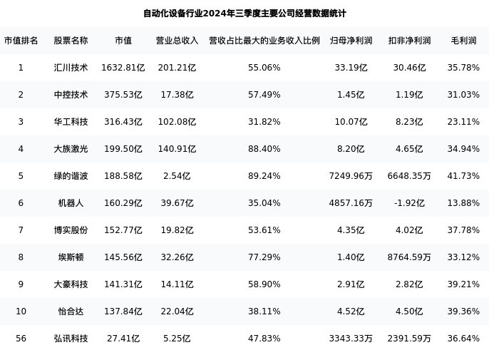 弘讯科技最新报告期数据为三季度,下表汇总了自动化设备行业内市值靠前的公司三季度主要经营数据