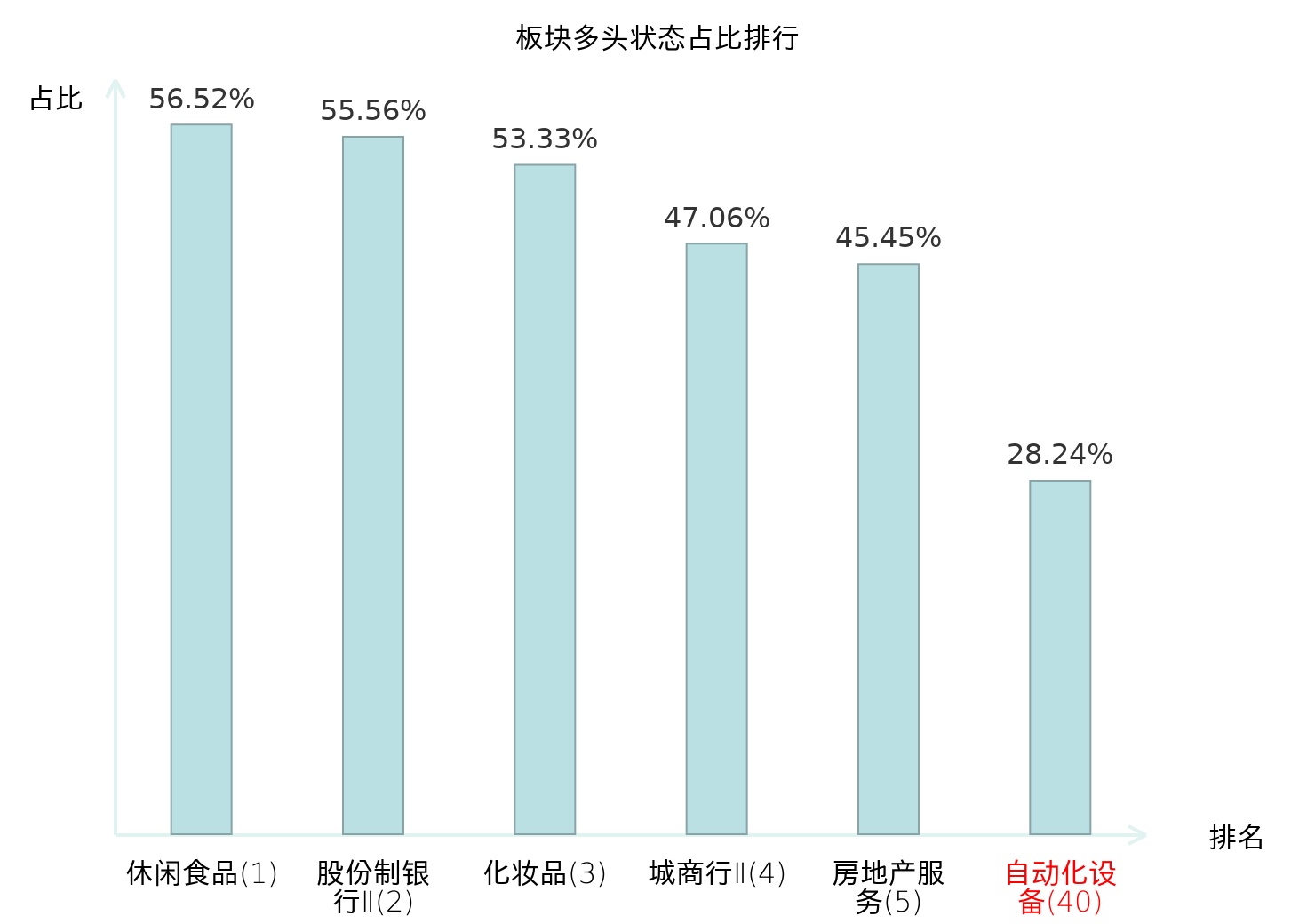 全市场所有行业板块中主力多头状态占比排名中,休闲食品板块位居第一。汽车服务板块名次提升最快,较昨日上升90位。