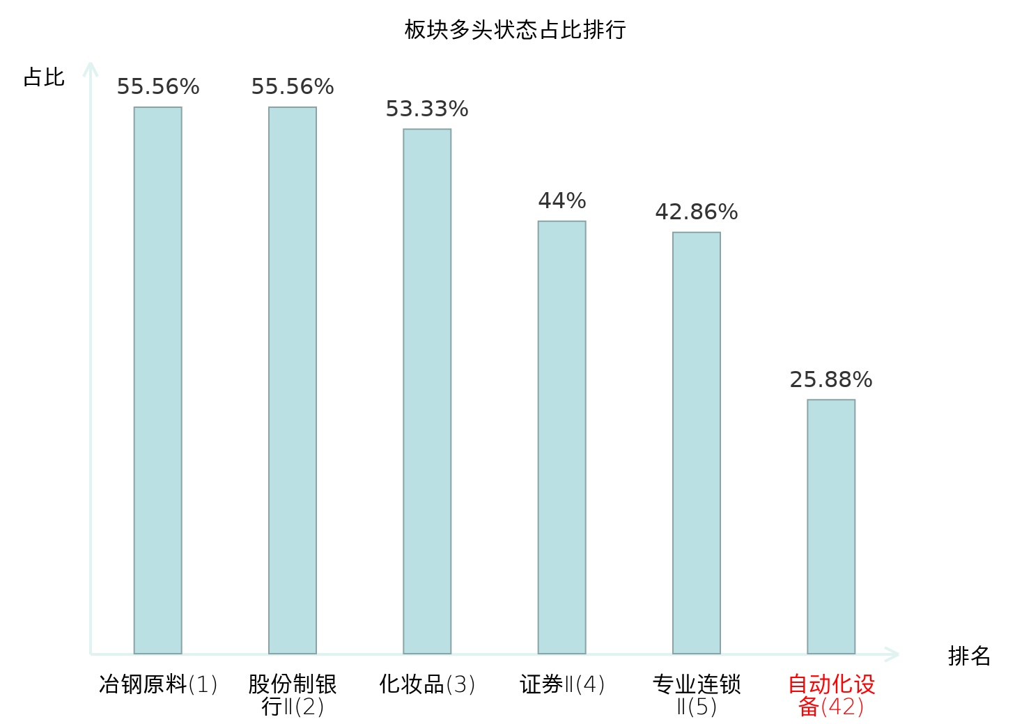 全市场所有行业板块中主力多头状态占比排名中,冶钢原料板块位居第一。保险Ⅱ板块名次提升最快,较昨日上升114位。
