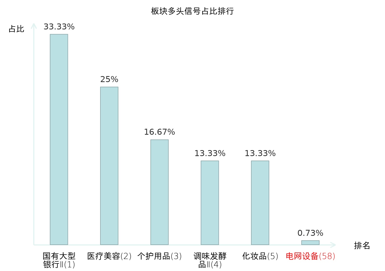 全市场所有行业板块中主力多头信号占比排名中,国有大型银行Ⅱ板块位居第一。医疗美容板块名次提升最快,较昨日上升125位。