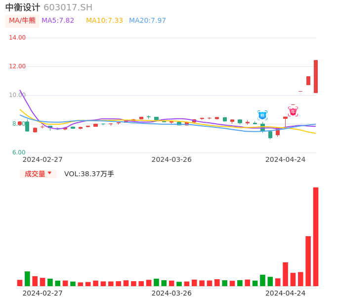 04月24日,中衡设计收报12.42,股价涨幅10.01%,成交金额4.40亿元,换手率13.91%。