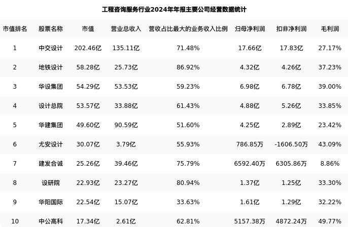 华设集团最新报告期数据为年报,下表汇总了工程咨询服务行业内市值靠前的公司年报主要经营数据