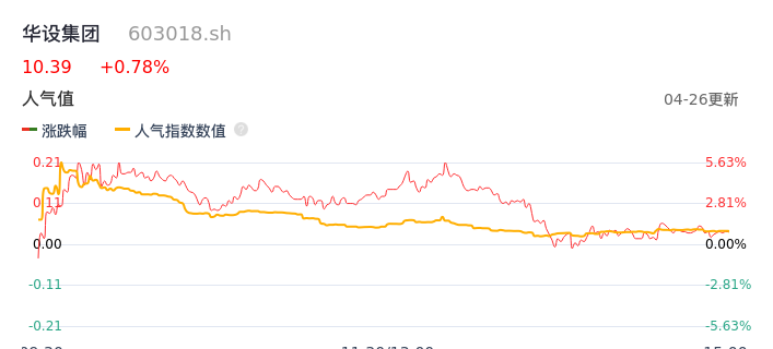 04月26日,华设集团收报10.39,股价涨幅0.78%,成交金额9.51亿元,换手率13.42%。