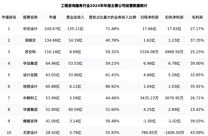 华设集团最新报告期数据为年报,下表汇总了工程咨询服务行业内市值靠前的公司年报主要经营数据