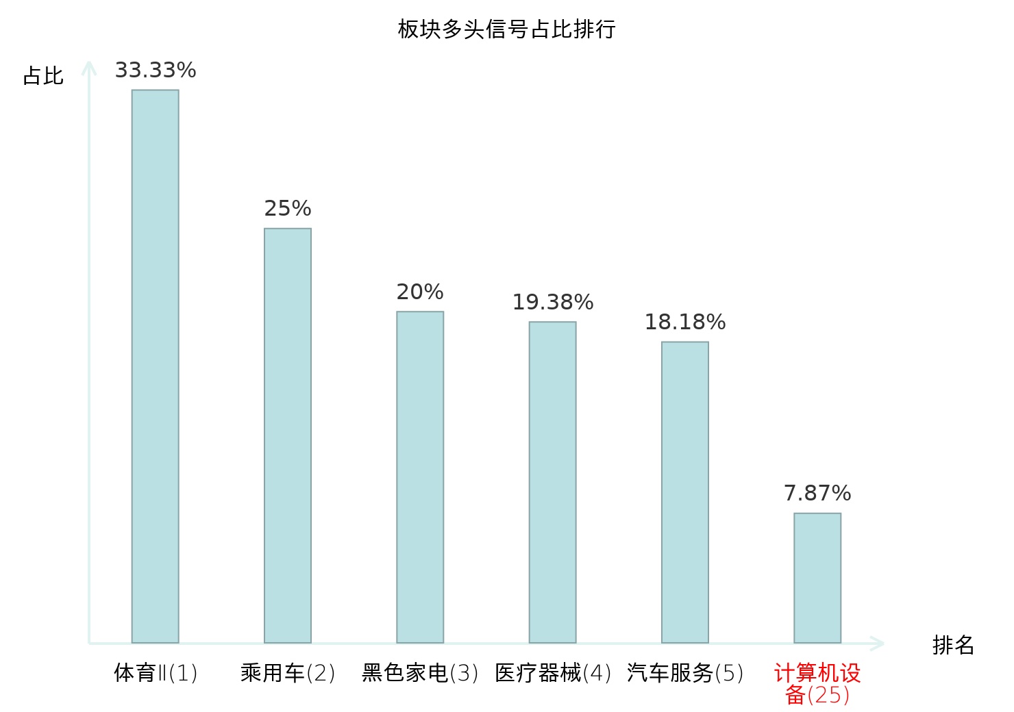 全市场所有行业板块中主力多头信号占比排名中,体育Ⅱ板块位居第一。体育Ⅱ板块名次提升最快,较昨日上升130位。