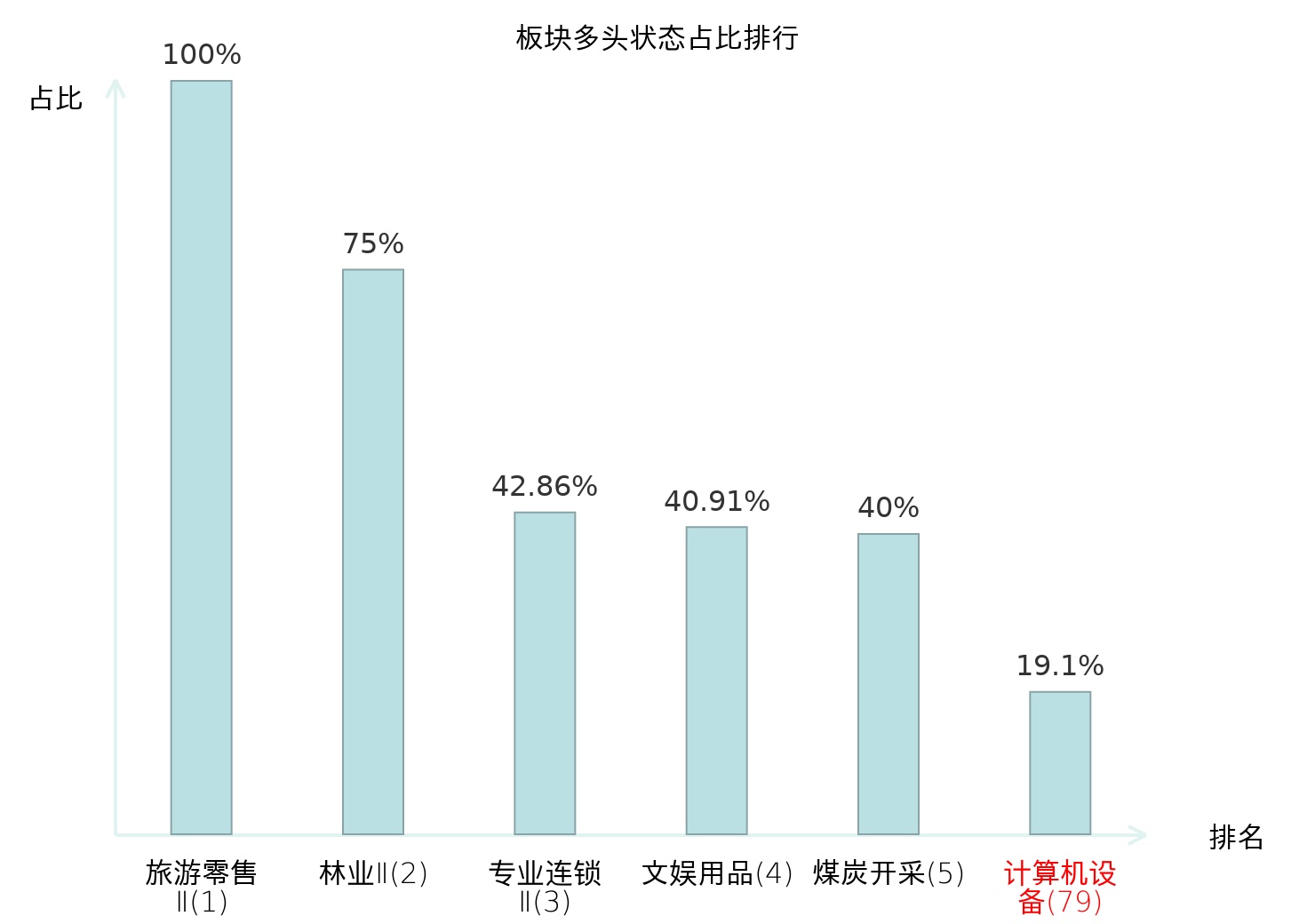 全市场所有行业板块中主力多头状态占比排名中,旅游零售Ⅱ板块位居第一。酒店餐饮板块名次提升最快,较昨日上升62位。