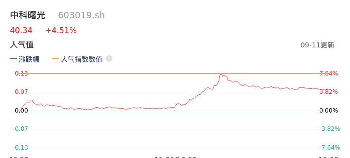 09月11日,中科曙光收报40.34,股价涨幅4.51%,成交金额25.36亿元,换手率4.35%。