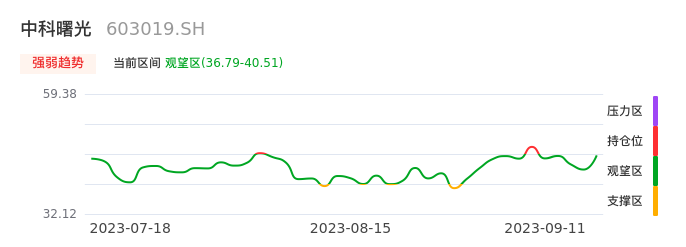 我们来看一下该股的九方特色指标强弱趋势的情况:中科曙光自09月05日从持仓区下穿到观望区。股价近期持续下跌后,短期出现止跌迹象。后续重点关注能否再次站上多空分界点:40.51元。如未能有效突破则可能进入新一轮空头行情。