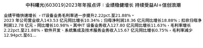 值得注意的是:2024年04月东北证券的分析师,首次发布关于中科曙光的研究报告,标题为:中科曙光(603019)2023年年报点评:业绩稳健增长 持续受益AI+信创浪潮。