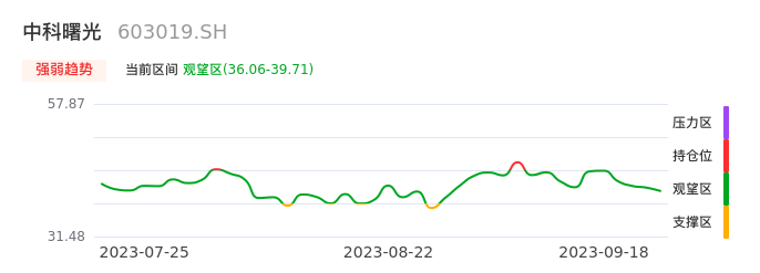 我们来看一下该股的九方特色指标强弱趋势的情况:中科曙光自09月05日从持仓区下穿到观望区,股价近期持续走弱。短期已经进入空头行情,且下跌动能仍未衰竭。建议继续谨慎观望。