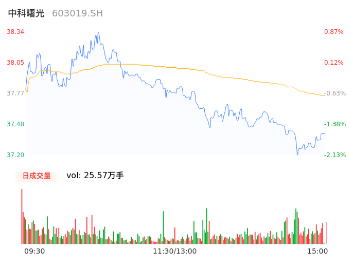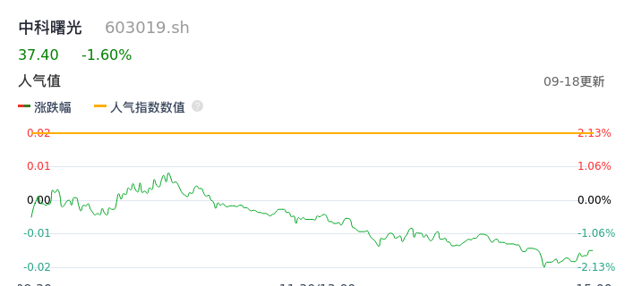 09月18日,中科曙光收报37.40,股价涨幅-1.60%,成交金额9.65亿元,换手率1.76%。