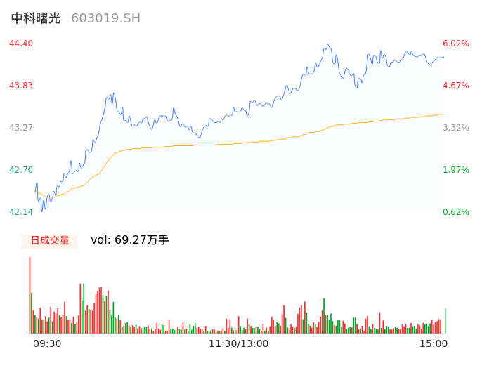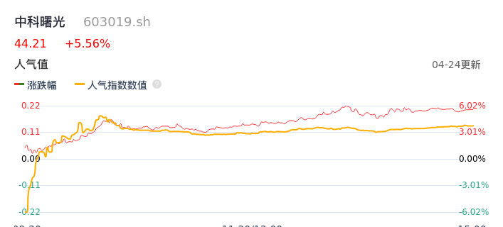 04月24日,中科曙光收报44.21,股价涨幅5.56%,成交金额30.10亿元,换手率4.76%。