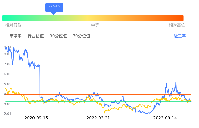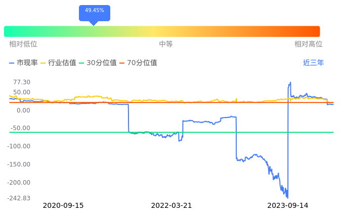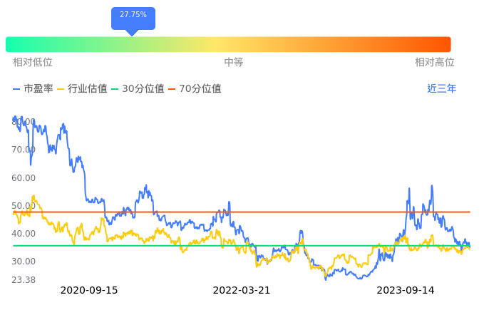 2023年09月14日,中科曙光下跌1.79%收于38.39,今日成交金额10.07亿元。下文将从市盈率PETTM、市净率PB、市现率3个角度去分析公司估值情况。