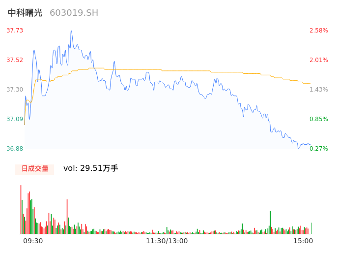 09月20日,中科曙光收报36.90,股价涨幅0.33%,成交金额11.02亿元,换手率2.03%。