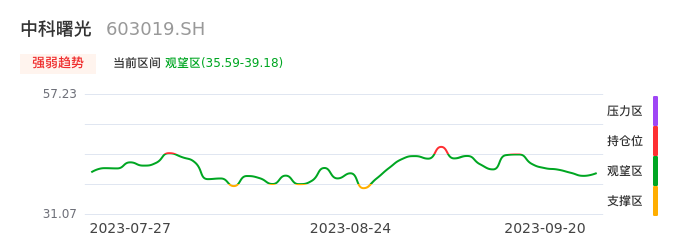 我们来看一下该股的九方特色指标强弱趋势的情况:中科曙光自09月05日从持仓区下穿到观望区。股价近期持续下跌后,短期出现止跌迹象。后续重点关注能否再次站上多空分界点:39.18元。如未能有效突破则可能进入新一轮空头行情。