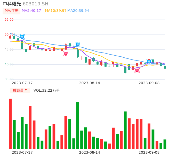 中科曙光近期出现日线级别熊点,且60分钟级别也处于熊点区间,股价处于偏弱行情,建议谨慎观望。