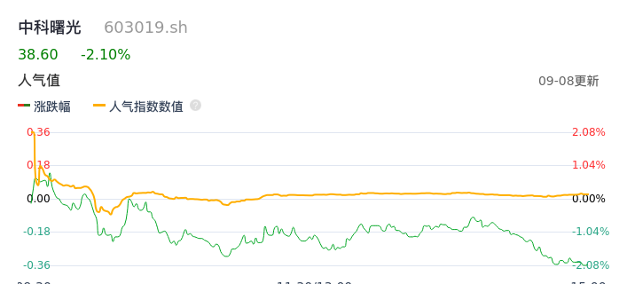 09月08日,中科曙光收报38.60,股价涨幅-2.10%,成交金额12.57亿元,换手率2.22%。