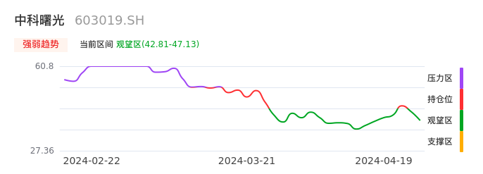 我们来看一下该股的九方特色指标强弱趋势的情况:中科曙光近日从持仓区下穿到观望区,股价出现持续性调整行情。短期已经转为空头行情,且下跌动能仍未衰竭。建议继续谨慎观望。