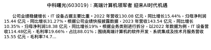 值得注意的是:2024年03月海通国际的杨林分析师,首次发布关于中科曙光的研究报告,标题为:中科曙光(603019):高端计算机领军者 迎来AI时代机遇。