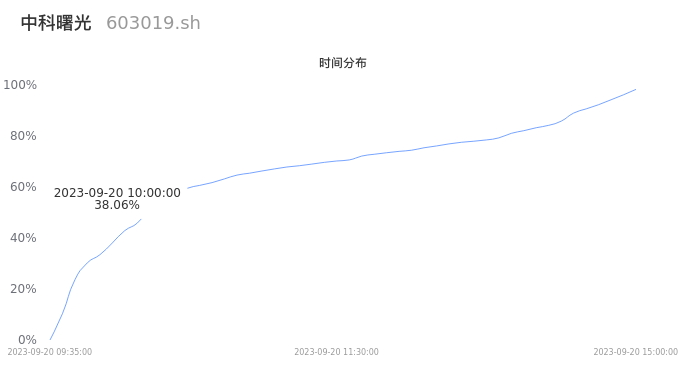 603019中科曙光2023年09月20日成交29.51万手,成交金额11.02亿元,相较昨日放量5.61万手,换手率2.03%,成交清淡。