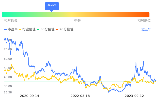 2023年09月13日,中科曙光下跌3.24%收于39.09,今日成交金额15.74亿元。下文将从市盈率PETTM、市净率PB、市现率3个角度去分析公司估值情况。