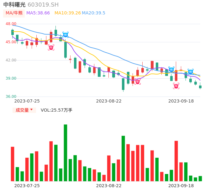 09月18日,中科曙光收报37.40,股价涨幅-1.60%,成交金额9.65亿元,换手率1.76%。