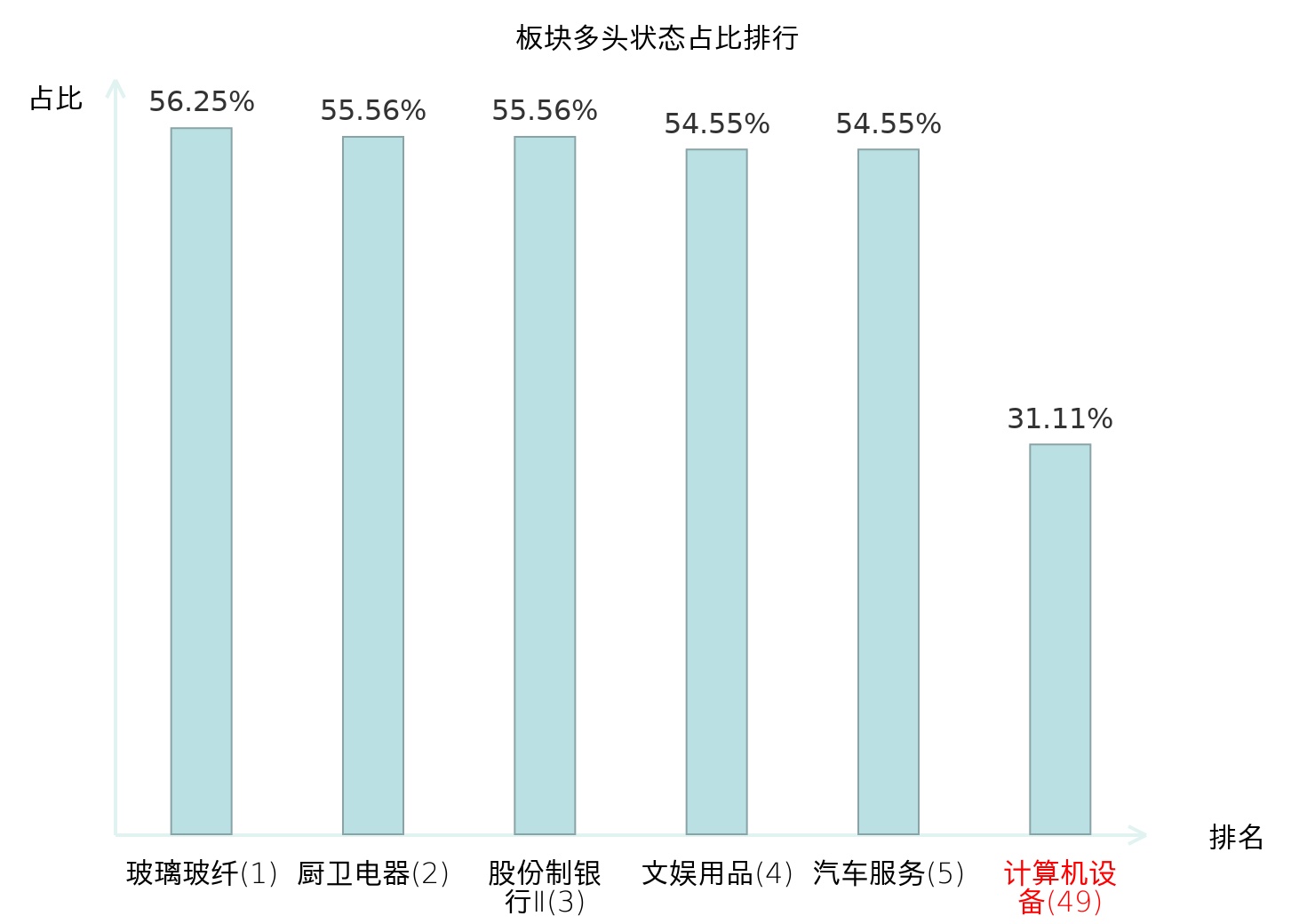 全市场所有行业板块中主力多头状态占比排名中,玻璃玻纤板块位居第一。航天装备Ⅱ板块名次提升最快,较昨日上升84位。