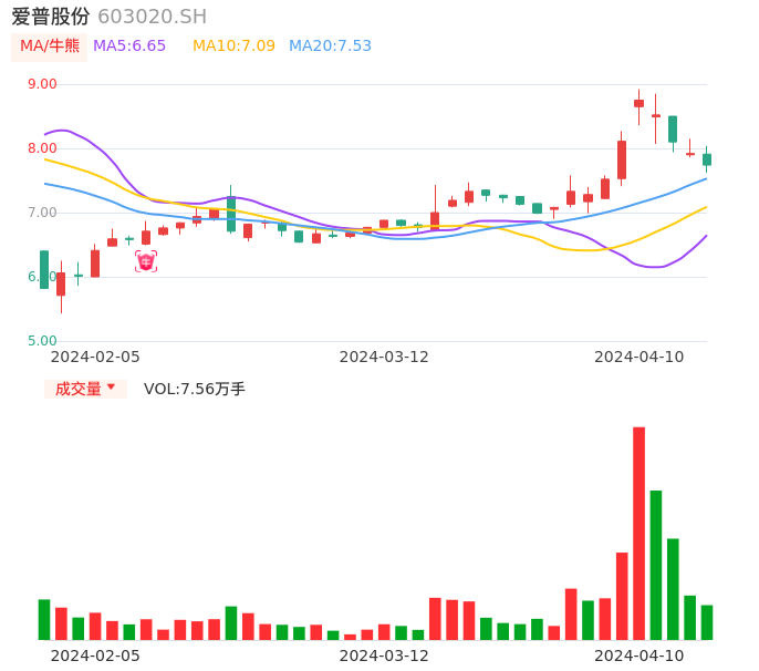 04月10日,爱普股份收报7.74,股价涨幅-2.27%,成交金额5901.98万元,换手率1.97%。