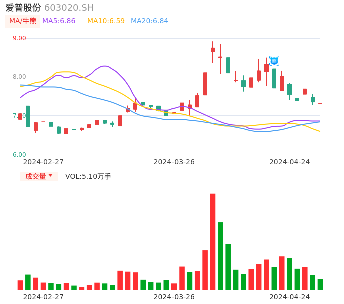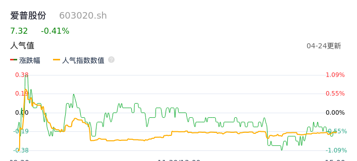 04月24日,爱普股份收报7.32,股价涨幅-0.41%,成交金额3732.50万元,换手率1.33%。