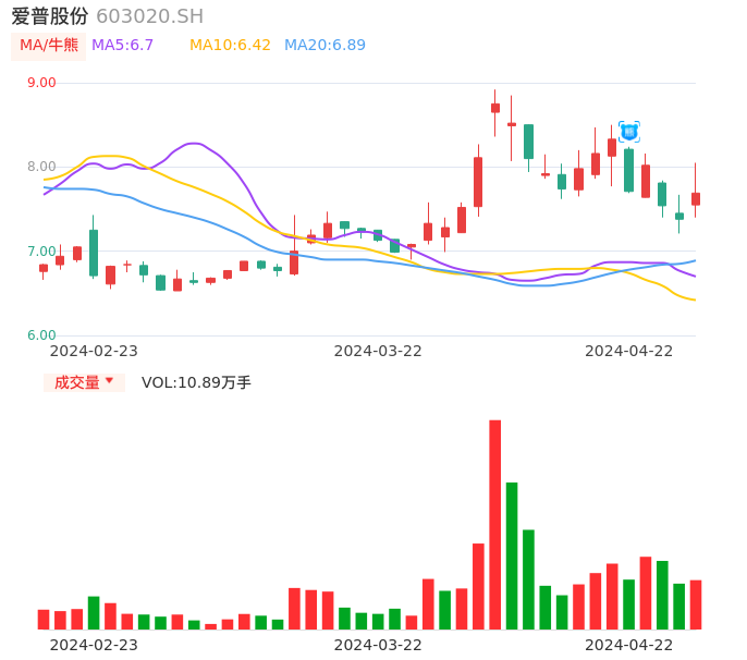 04月22日,爱普股份收报7.69,股价涨幅4.20%,成交金额8502.90万元,换手率2.84%。