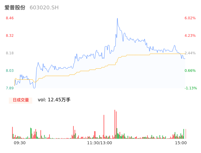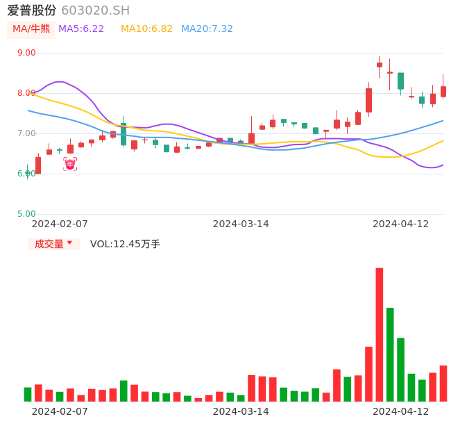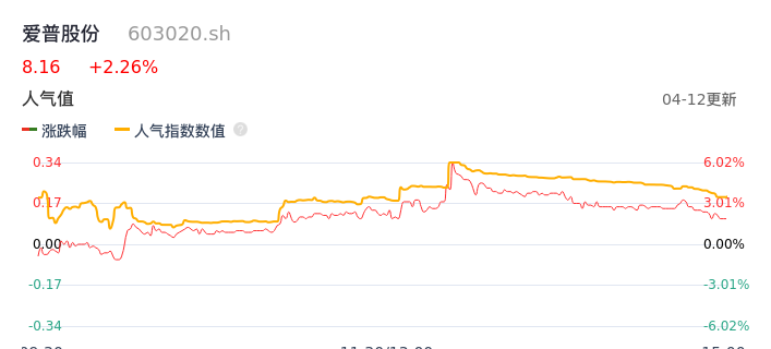 04月12日,爱普股份收报8.16,股价涨幅2.26%,成交金额1.02亿元,换手率3.25%。