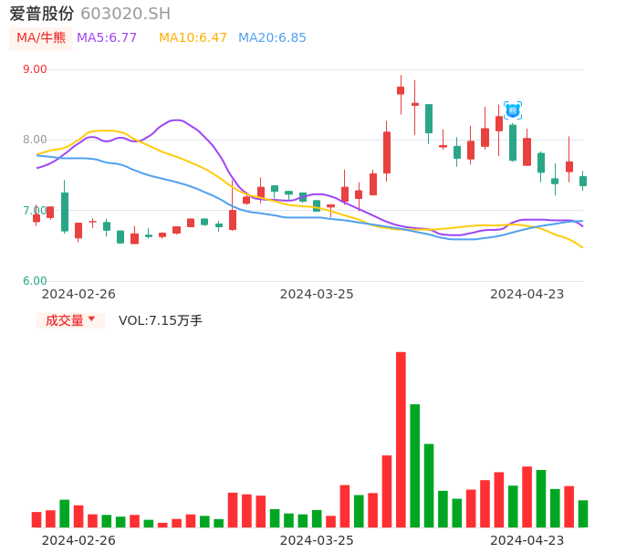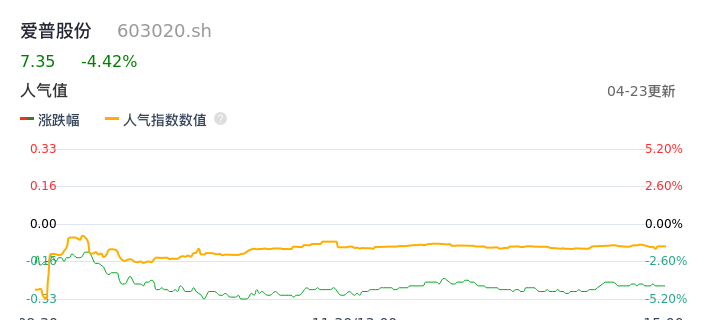 04月23日,爱普股份收报7.35,股价涨幅-4.42%,成交金额5285.12万元,换手率1.86%。