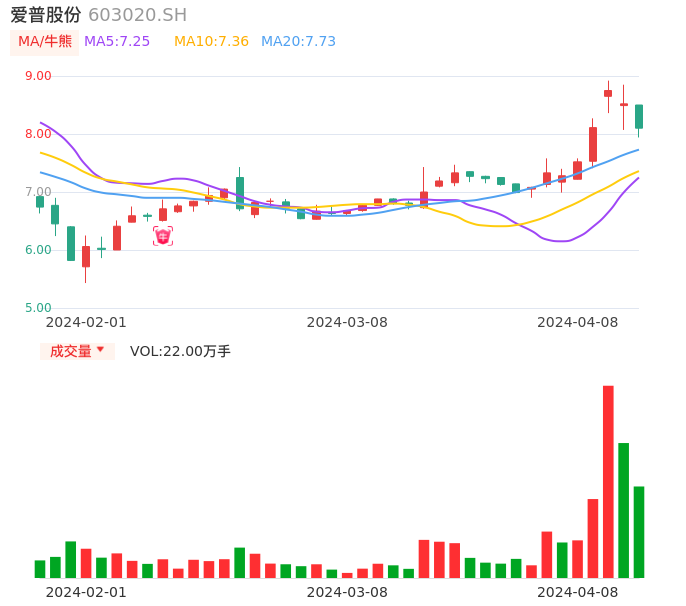 04月08日,爱普股份收报8.10,股价涨幅-4.93%,成交金额1.79亿元,换手率5.74%。