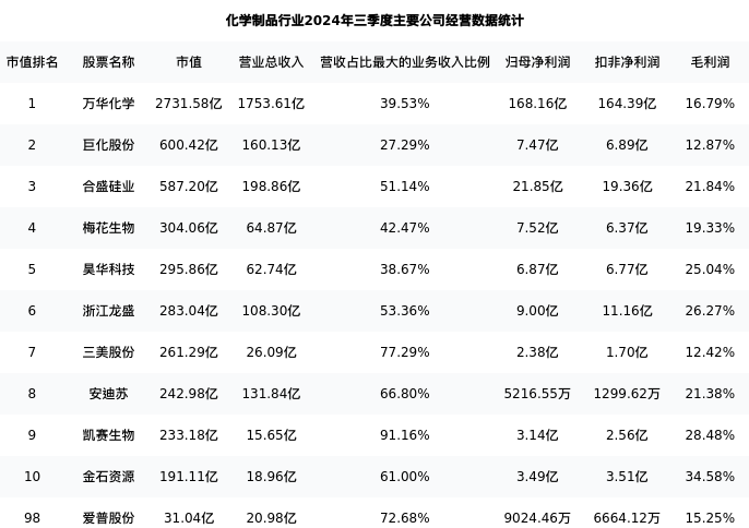 爱普股份最新报告期数据为三季度,下表汇总了化学制品行业内市值靠前的公司三季度主要经营数据