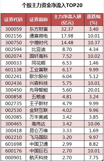 个股来看,今日有2111只个股获主力资金净流入,其中,87股获主力资金净流入超1亿元。东方财富主力资金净流入最多,净流入金额为32.37亿元;主力资金净流入居前的个股还有通富微电、宁德时代、比亚迪、国轩高科、同花顺等,净流入金额分别为17.98亿元、14.48亿元、8.7亿元、7.52亿元、6.53亿元。