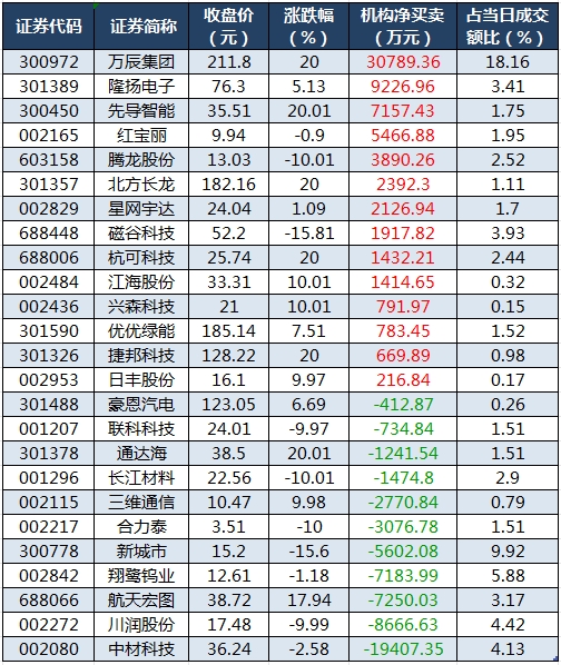 盘后龙虎榜数据显示,今日机构席位资金合计净买入约1.05亿元。其中,净买入的个股14只,净卖出的个股11只。机构净买入最多的股票是万辰集团,净买入金额约3.08亿元;机构净买入居前的还有隆扬电子、先导智能、红宝丽等股。机构净卖出最多的股票是中材科技,净卖出金额约1.94亿元;机构净卖出居前的还有川润股份、航天宏图、翔鹭钨业等股。