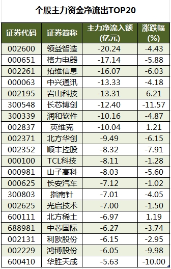 今日有3030只个股被主力资金净卖出,其中,222股被主力资金净卖出超1亿元。主力资金净流出最多的个股是领益智造,净流出金额为20.24亿元;主力资金净流出居前的个股还有格力电器、拓维信息、中兴通讯、岩山科技、长芯博创等,净流出金额分别为17.14亿元、16.07亿元、13.33亿元、13.31亿元、12.4亿元。