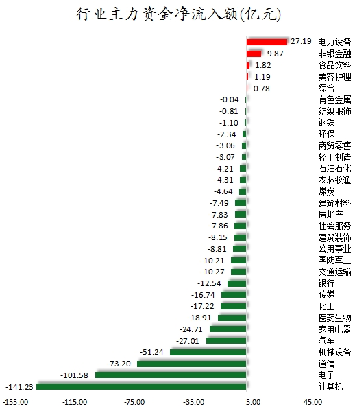 从行业来看,申万所属的31个一级行业,今日有5个行业主力资金呈现净流入,其中,电力设备行业主力资金净流入最多,净流入金额为27.19亿元;行业主力资金净流入居前的还有非银金融、食品饮料等,净流入金额分别为9.87亿元、1.82亿元。26个行业主力资金呈现净流出,其中,计算机行业主力资金净流出最多,净流出金额为141.23亿元;行业主力资金净流出靠前的还有电子、通信、机械设备、汽车、家用电器、医药生物等,净流出金额分别为101.58亿元、73.2亿元、51.24亿元、27.01亿元、24.71亿元、18.91亿元。