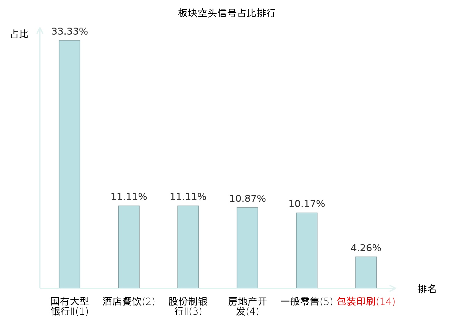 全市场所有行业板块中主力空头信号占比排名中,国有大型银行Ⅱ板块位居第一。专业工程板块名次提升最快,较昨日上升104位。