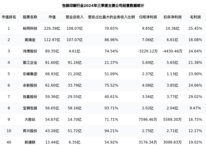 新通联最新报告期数据为三季度,下表汇总了包装印刷行业内市值靠前的公司三季度主要经营数据