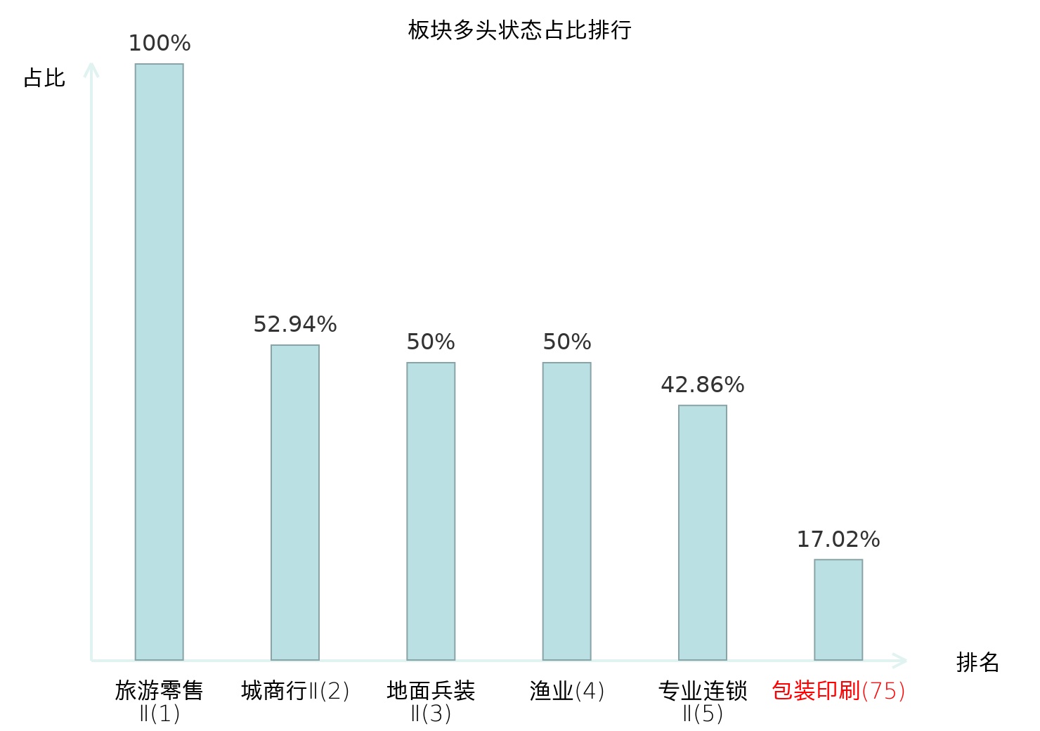 全市场所有行业板块中主力多头状态占比排名中,旅游零售Ⅱ板块位居第一。旅游及景区板块名次提升最快,较昨日上升69位。