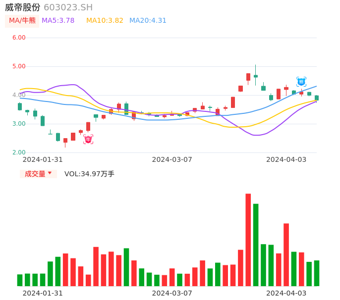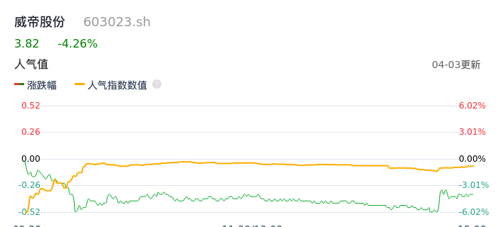 04月03日,威帝股份收报3.82,股价涨幅-4.26%,成交金额1.34亿元,换手率6.22%。