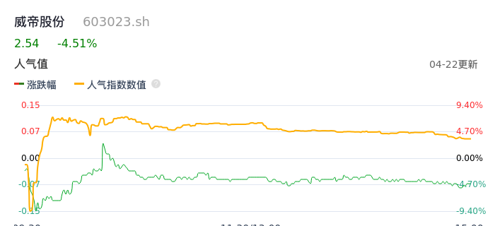 04月22日,威帝股份收报2.54,股价涨幅-4.51%,成交金额8155.39万元,换手率5.71%。