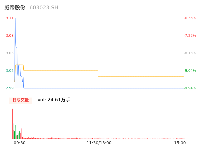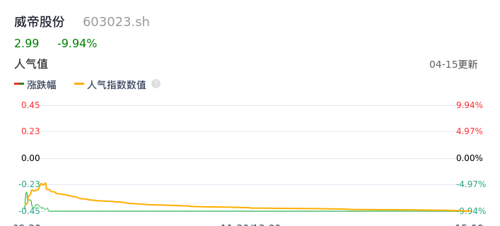 04月15日,威帝股份收报2.99,股价涨幅-9.94%,成交金额7415.44万元,换手率4.38%。