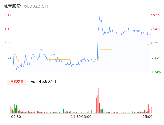 04月01日,威帝股份收报4.11,股价涨幅1.99%,成交金额1.87亿元,换手率8.17%。
