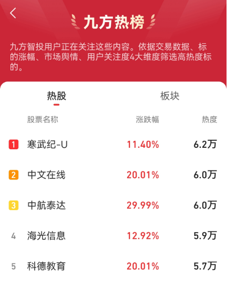 九方智投:寒武纪-U,中文在线、中航泰达、海光信息、科德教育